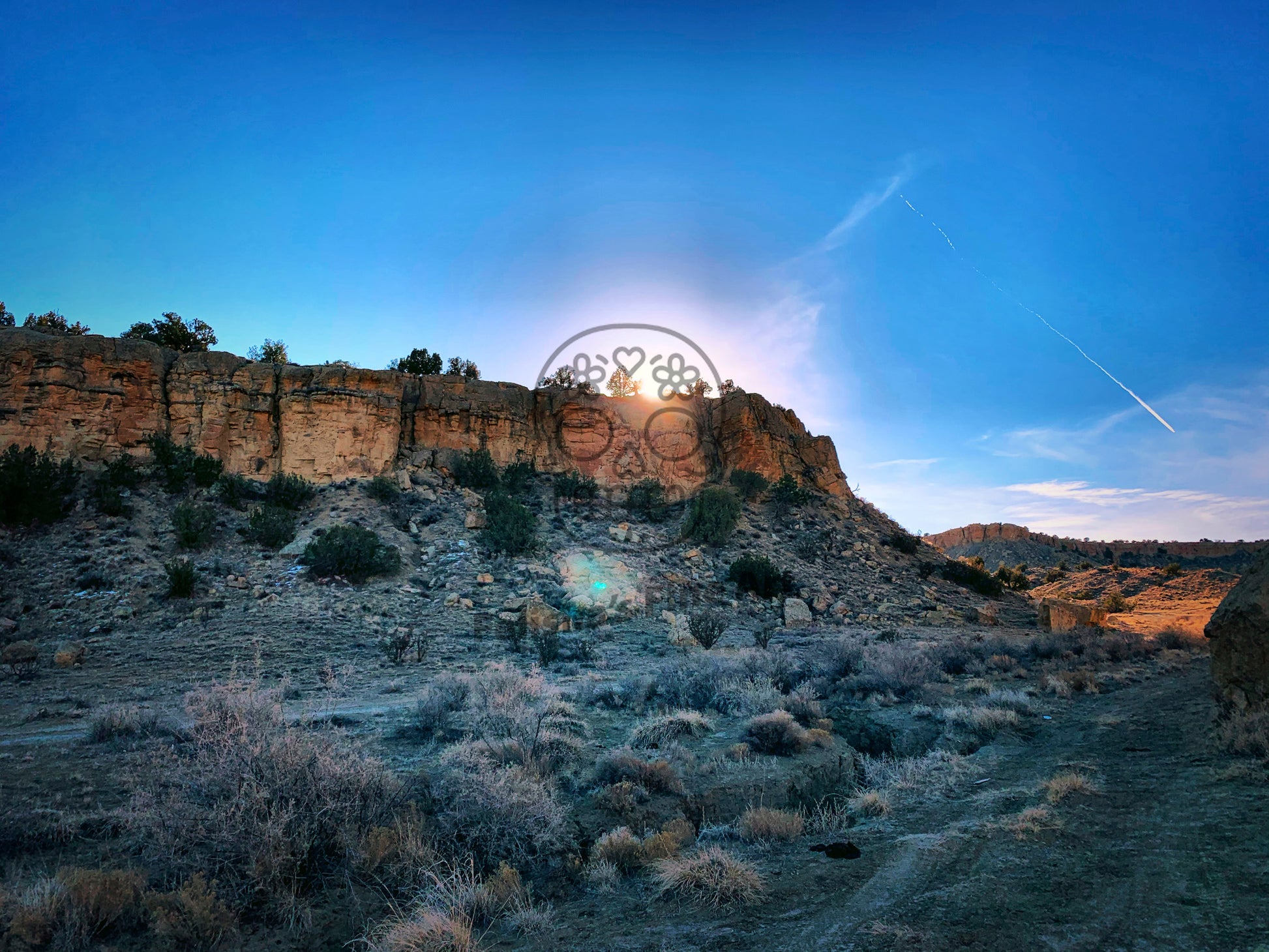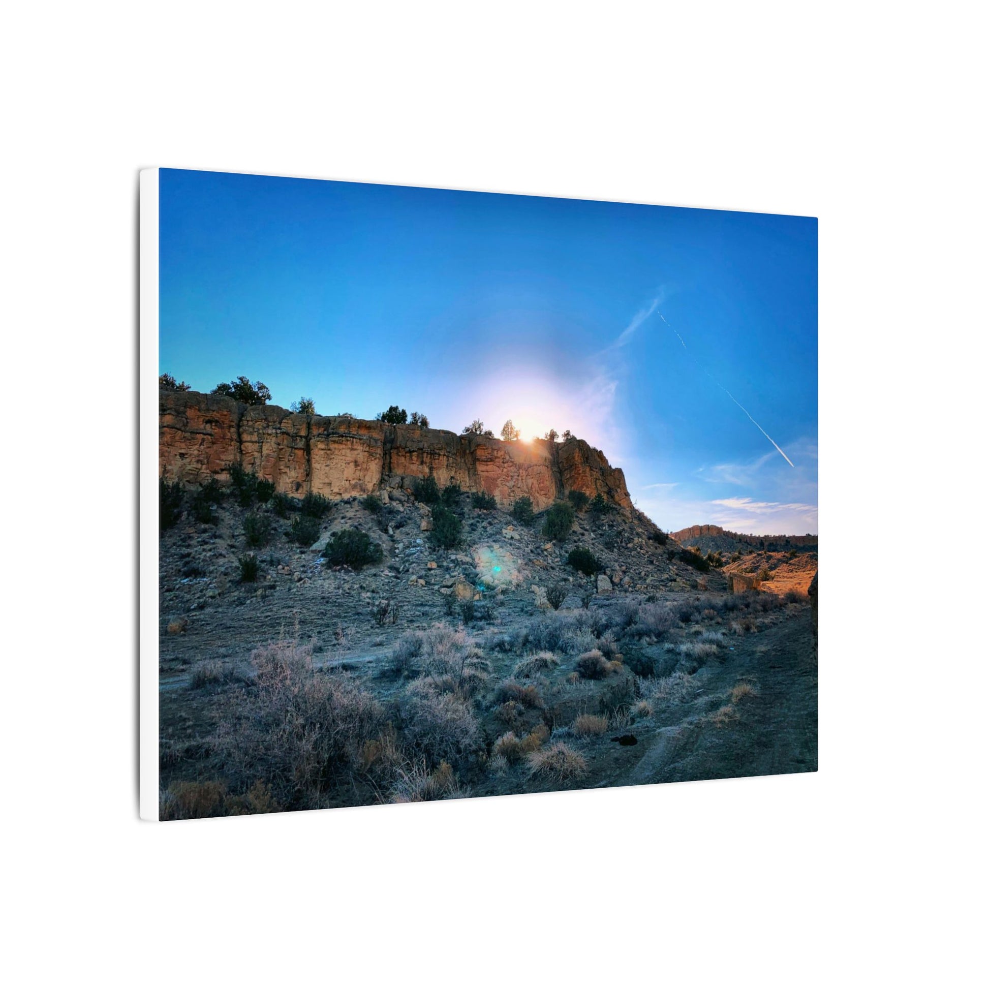 Capture the ethereal beauty of the American Southwest with "Contrail to Heaven," a luxury landscape photography canvas that evokes serenity, strength, and the sacred quiet of desert twilight. Set against a clear cobalt sky, a glowing sun crests a timeless sandstone cliff while a lone contrail arcs through the heavens — a poetic reminder of movement and stillness in one frame.